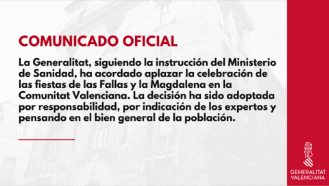 La Generalitat ha anunciado aplazar la celebración de las fiestas de las fallas y de la Magdalena en toda la Comunitat Valenciana para evitar el contagio del Coronavirus.