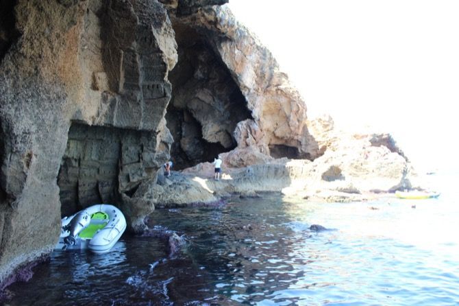 Ayer, en el interior de la Cova Tallada dos pequeñas lanchas neumáticas con su motor, amarradas a las rocas, en cierta manera escondidas para que no se pudieran ver.