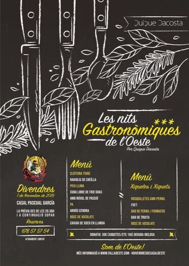 El pròxim divendres 1 de novembre la Falla Oeste celebrarà un sopar gastronòmic del més alt nivell: la primera cita de #LesNitsGatronòmiquesDelOeste. Un sopar de 3 estrelles cuinada i servida pel gran equip de Quique Dacosta.