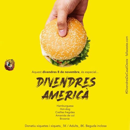 El pròxim divendres 8 de novembre, al nostre Casal Pascual García, podreu gaudir d'un sopar orientat amb la temàtica americana, en el que podrem degustar unes hamburgueses i uns hot dogs al més pur estil americà. Tot això acompanyat d'unes fantàstiques creïlles fregides, amanida de col i brownie. A més, comptarem amb menjar lliure de gluten.