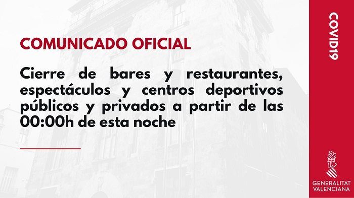 El president de la Generalitat, Ximo Puig, ha anunciado un decreto por el que ordena el cierre de todos los bares, restaurantes, centros deportivos públicos y privados, y espectáculos en general desde este noche a partir de las 00.00 horas.