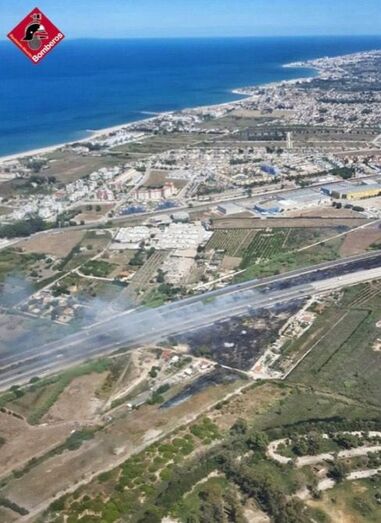 Los Bomberos del Consorcio Provincia así como diversos medios aéreos trabajan desde las 15.30 de este jueves en la extinción de un incendio que se ha declarado en la AP-7 a la altura del antiguo Safari Park de El Verger.