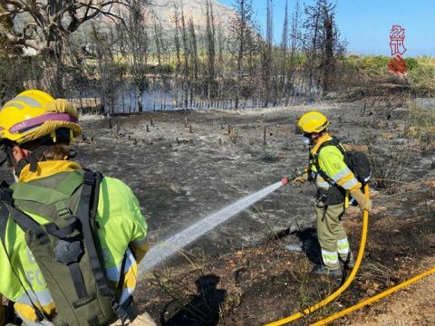 Los bomberos trabajan en la extinción de un incendio en la partida Benimadrocs de Xàbia