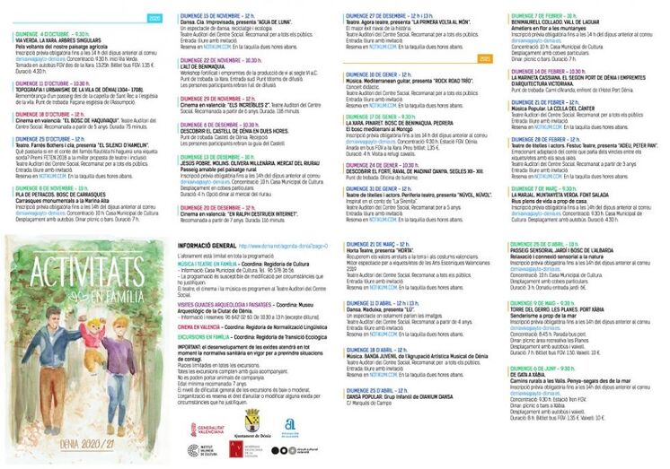 De octubre 2020 a junio 2021 el público podrá elegir entre cerca de 30 propuestas muy variadas: actuaciones de música, danza y teatro, coordinadas por la Concejalía de Cultura; proyecciones de cine en valenciano, seleccionadas por la Concejalía de Normalización Lingüística; las visitas guiadas “Arqueología y paisajes”, organizadas por el Museo Arqueológico de la Ciudad de Dénia; y las salidas por parajes naturales de Dénia y la comarca que propone el programa “Excursiones en familia” diseñado por Concejalía de Transición Ecológica.