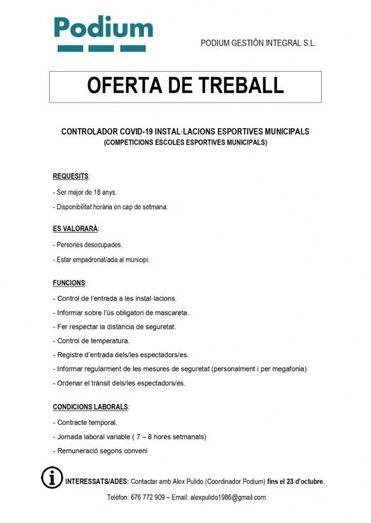La empresa Podium Gestion Integral busca un controlador covid-19 para las instalaciones deportivas municipales de Pedreguer.