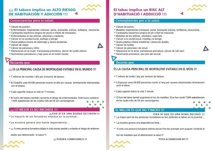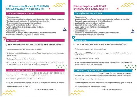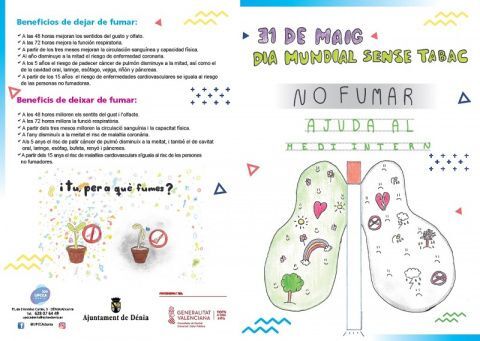 El Ayuntamiento de Dénia, desde la Concejalía de Prevención de Adicciones, promueve un año más la campaña alrededor del 31 de mayo, Día mundial sin tabaco, que ya cumple 19 ediciones. El material de la campaña, que tiene como lema No fumar ayuda al medio interno, ha sido ideada e ilustrada por las jóvenes Claudia Navarro y Mariela Ballester, de 3º de ESO del IES Historiador Chabás.