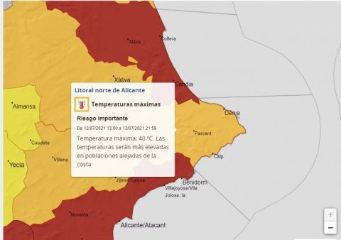La Agencia Estatal de Meteorología ha activado la alerta amarilla por altas temperaturas para este sábado 3 y el domingo 4 de julio, en toda la Marina Alta, la Safor y la provincia de Alicante.