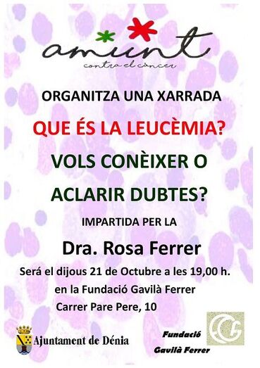 La asociación Amunt contra el Càncer ha organizado para el próximo 21 de octubre una charla en la Fundació Gavilà Ferrer para explicar en que consiste la leucemia.