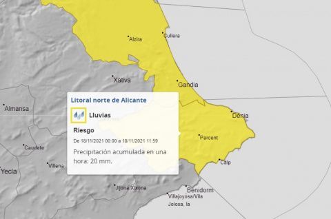 Aemet activa un aviso con la alerta amarilla por lluvias en la Marina Alta