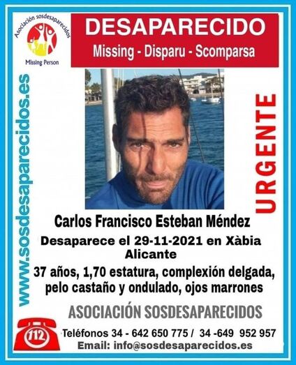 Carlos Francisco Esteban Méndez, de 37 años, desapareció en Xàbia el pasado 29 de noviembre. Ha pasado un mes y todavía no ha sido localizado.