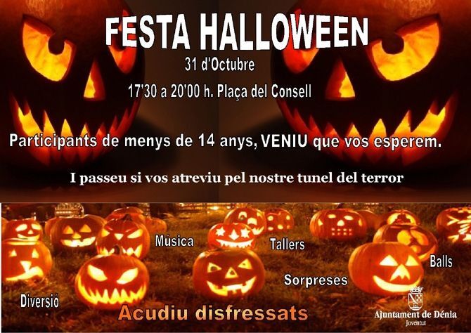 La Concejalía de Juventud ha organizado una fiesta infantil-juvenil para celebrar Halloween el sábado 31 de octubre. A las 17.30 horas, en la plaza del Consell, comenzarán las actividades para menores de 14 años. Habrá talleres de pintura, maquillaje y calabazas, discomóvil, sorpresas y bailes. A las 18.15 horas se iniciará un paseo por el túnel del castillo, convertido para la ocasión en un túnel del terror, donde los más pequeños podrán ir acompañados por sus familiares. En caso de lluvia, las actividades previstas se trasladarán a la Sala Polivalente de Llunàtics. La fiesta para los más pequeños finalizará a las 20 horas.