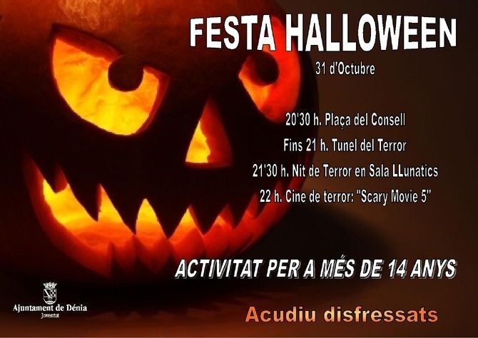 La Concejalía de Juventud ha organizado una fiesta infantil-juvenil para celebrar Halloween el sábado 31 de octubre. A las 17.30 horas, en la plaza del Consell, comenzarán las actividades para menores de 14 años. Habrá talleres de pintura, maquillaje y calabazas, discomóvil, sorpresas y bailes. A las 18.15 horas se iniciará un paseo por el túnel del castillo, convertido para la ocasión en un túnel del terror, donde los más pequeños podrán ir acompañados por sus familiares. En caso de lluvia, las actividades previstas se trasladarán a la Sala Polivalente de Llunàtics. La fiesta para los más pequeños finalizará a las 20 horas.A las 20.30 horas, los mayores de 14 años tienen una cita en la plaza del Consell para cruzar el ‘túnel del terror’ de camino a la Sala Polivalente de Llunàtics. Una vez allí, habrá actuaciones ‘a micrófono abierto’ para que los asistentes cuenten historias de terror. Quienes deseen participar deben inscribirse previamente en la oficina de Llunàtics.