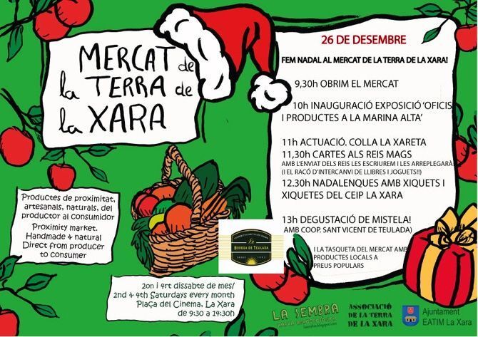 El Mercat de la Terra de la Xara abrirá de nuevo próximo sábado, 26 de diciembre, como cada segundo y cuarto sábado de mes, en horario de 9,30 a 14,30h en la Plaza del Cine de la Xara. El Mercat está organizado por la Associació per la Terra de la Xara con Sembra Xarxa agroecològica y la colaboración del Ajuntament de la Xara.