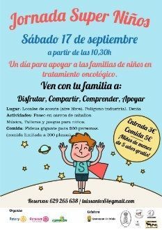 El distrito Rotary organiza la jornada Super Niños, un día para apoyar a las familias que tienen entre sus miembros un menor con cancer. En colaboración con Aspanion, organizan un día al aire libre en el polígono industrial de Dénia con numerosas actividades para toda la familia y una fideuà gigante. La entrada son 3 euros y si quieres comer son 5 euros. Desde las 10.30 horas.
