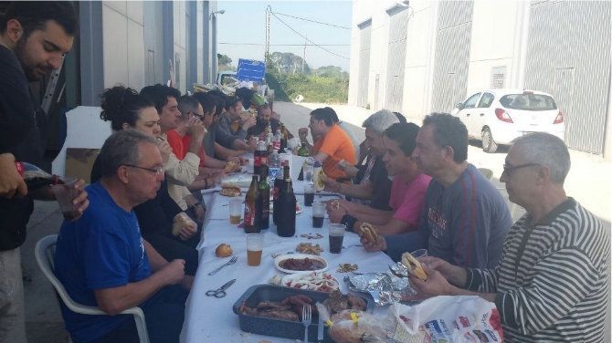 Entre feina i feina vam prendre forces pegant un mosset en una barbacoa que ens va realitzar el nostre President, Manuel Marco. Encara que sembla que en falta molt fins a les festes de la Santíssima Sang, el temps passa molt apresa, així que si vostès s’acosten a les naus de la festa, ens trobaran treballant i creant. No s’ho perden, és temps de carrossa!