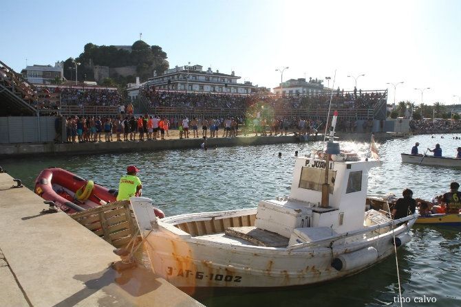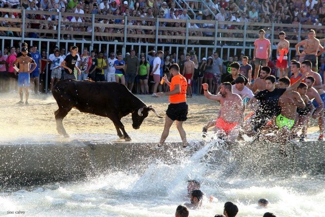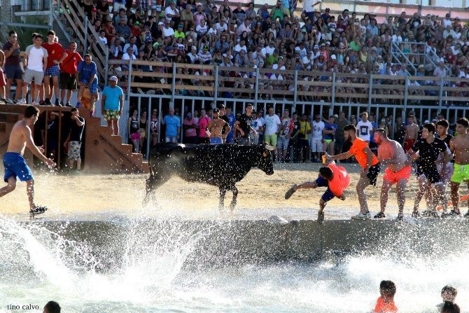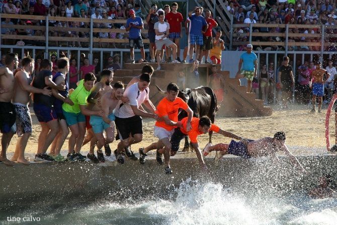 Hoy en la sesión de toros de la tarde, los improvisados toreros han desafiado a la gravedad para conseguir que el toro cayera al agua. Han recurrido a todo tipo de tretas y trucos para que el toro acabara en el agua. Alguno de los pobres toros no lo ha podido resistir y se ha dado un remojón.