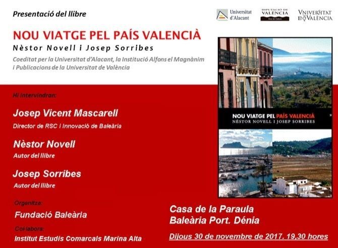 La Fundació Baleària presenta el pròxim dijous 30 de novembre a les 19.30 hores a la Casa de la Paraula (Baleària Port) Nou viatge pel País Valencià, de Nèstor Novell i Josep Sorribes; una indagació comarca a comarca sobre la realitat social, econòmica i humana i les perspectives de futur en l’era post-crisi.