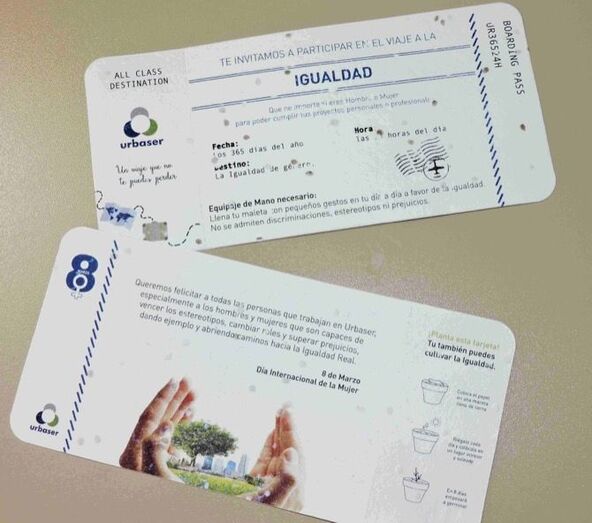Este pasaje para el viaje hacia la igualdad tiene, además, una particularidad: permite a la persona que lo posee “cultivar la igualdad” plantando la tarjeta en una maceta con tierra para que germinen las semillas que tiene adheridas.