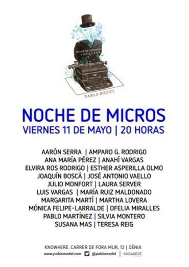 El alumnado del Taller de Escritura Creativa de Pablo Medel ofrecerá el próximo viernes 11 de mayo, a las 20 horas, una lectura conjunta de veinte microrrelatos, bajo el título de “Noche de Micros”.