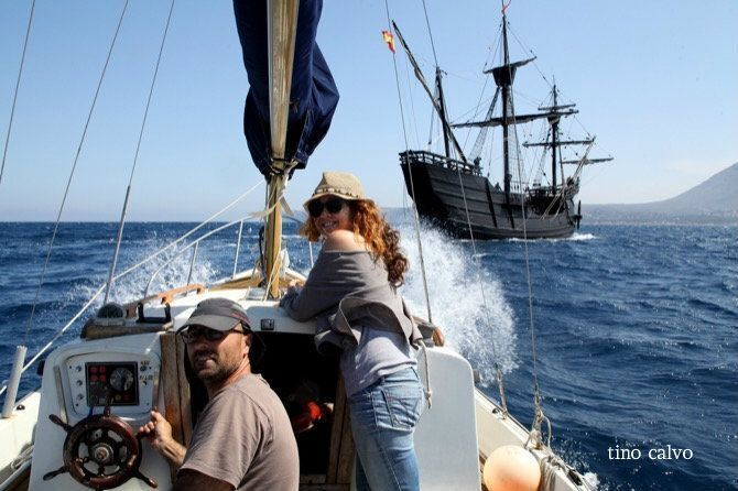 De la mano de la Fundación Salom Sabar, la Nao Victoria ha sido recibida en la bocana del puerto por la embarcación de esta fundación La Reina Azul. Allí un juego de bocinas ha dado a conocer la presencia de la histórica nave.