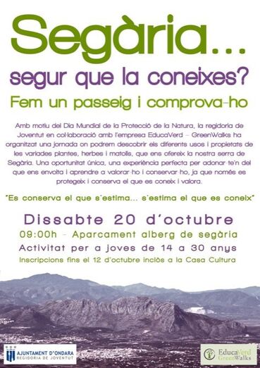 La Concejalía de Juventud del Ayuntamiento de Ondara, dirigida por José Ramiro, con motivo del Día Mundial de Protección de la Naturaleza (cuya efeméride es el 18 de octubre), ha organizado para el sábado 20 de octubre una jornada en la Sierra de Segària. Se trata de “Segària...segur que la coneixes? Fem un passeig i comprova-ho”. Una cita dirigida a jóvenes de 14 a 30 años que tendrá la salida a las 9 horas desde el aparcamiento del Albergue de Segària. Las inscripciones son gratuitas y se pueden realizar hasta el 12 de octubre en la Casa de Cultura de Ondara.