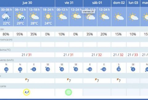 La Agencia Estatal de Meteorología mantiene activada hasta las 18 horas de este viernes la alerta amarilla por fuertes lluvias en Dénia y toda la Marina Alta. Además tmabién está activo el aviso por fuertes tormentas.