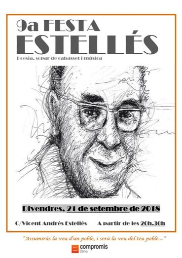 Un any més Compromís per Dénia vol recordar a Vicent Andrés Estellés amb l’organització de la tradicional Festa Estellés, una nit dedicada al poeta de Burjassot i a la cultura valenciana, i que està inspirada en les “Burns Supper” celebrades a Escòcia en honor al poeta Robert Burns. Enguany, la cita serà el pròxim divendres 21 de setembre, a partir de les 20.30 hores, al carrer que porta el nom del poeta, junt a la Glorieta del País Valencià.