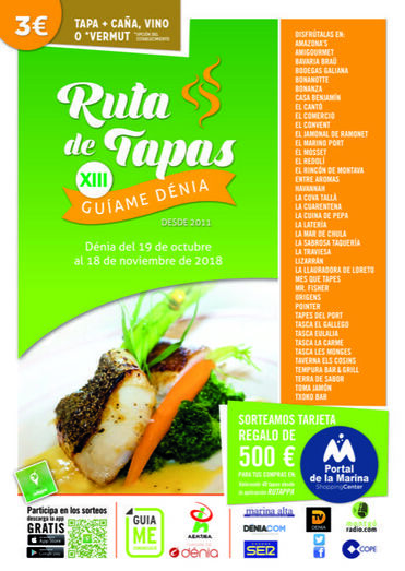 La Ruta de Tapas GuíaME Dénia, que organiza GuíaME Comunicació con la colaboración de Turismo Dénia y la Asociación de Empresarios de Hostelería y Turismo de la Marina Alta (AEHTMA), celebra su decimotercera edición del 19 de octubre al 18 de noviembre, con la participación de 40 locales de restauración. Todos los restaurantes y bares que participan servirán la tapa que han creado para esta ruta con consumición de vino, caña o vermú incluida, al precio de 3 euros.