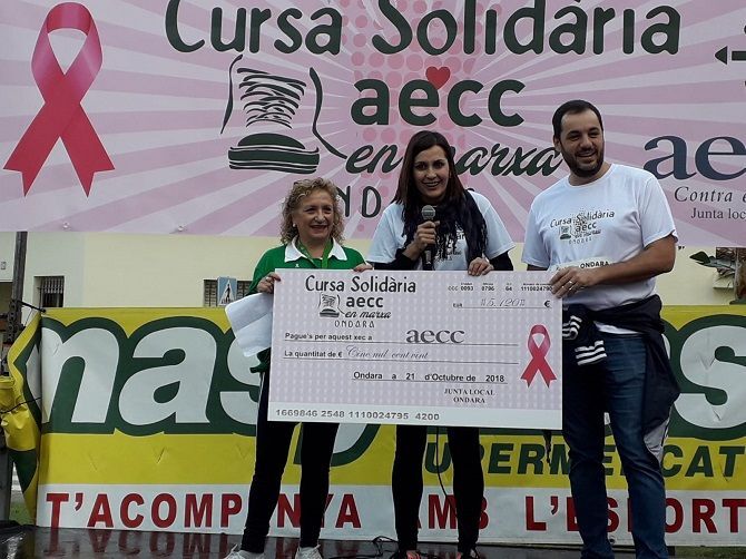 Un evento solidario organizado por la Concejalía de Deportes del Ayuntamiento de Ondara y la Junta Local de la AECC, con la colaboración del Club de Atletismo de Ondara, que consiguió su objetivo: recaudar fondos para la lucha contra el cáncer. Se recaudaron un total de 5.120 euros, que fueron entregados simbólicamente en un gran cheque a nombre de AECC, que fue otorgado por el Alcalde de Ondara, José Ramiro, y la Concejala de Deportes, Mar Chesa, a la presidenta de la Junta Local de AECC, Mª Carmen Bisquert, quien destacó en su discurso la importancia de la prevención precoz en el cáncer de mama.