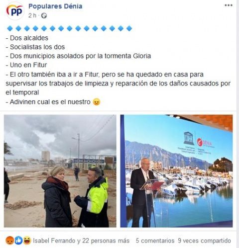 El alcalde de Dénia, Vicent Grimalt, se refirió ayer a preguntas de los periodistas a las críticas lanzadas por el PP local durante la pasada semana por su presencia en Madrid, en la feria internacional de turismo, Fitur, y no en la capital comarcal liderando las tareas de recuperación tras el temporal Gloria.