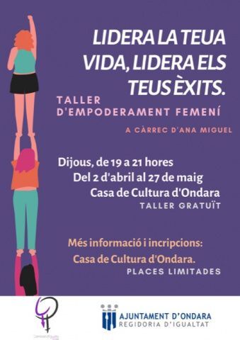 La Concejalía de Igualdad del Ayuntamiento de Ondara ha organizado la celebración de un taller gratuito de empoderamiento femenino que se realizará durante los meses de abril y mayo, con plazas limitadas. Se trata del taller “Lidera tu vida, lidera tus éxitos”, que será impartido por Ana Miguel, Coach Personal y Ejecutiva, Terapeuta sistémica. El taller se impartirá en la Casa de Cultura de Ondara todos los jueves de los meses de abril y mayo, de 19 a 21 horas, con un total de 8 sesiones de 2 horas de duración (la duración total del taller es de 16 horas). Las plazas son limitadas, y para inscribirse hay que acudir a la Casa de Cultura de Ondara. Ana Miguel imparte en la actualidad el curso de mindfulness que ofrece la Concejalía de Cultura de Ondara; un curso que tiene mucho éxito entre el alumnado.