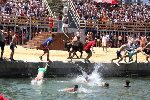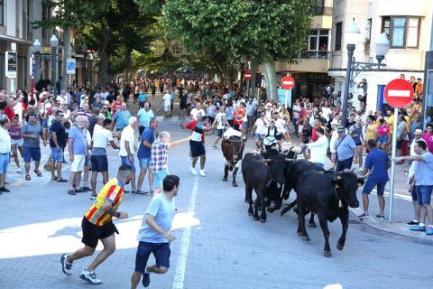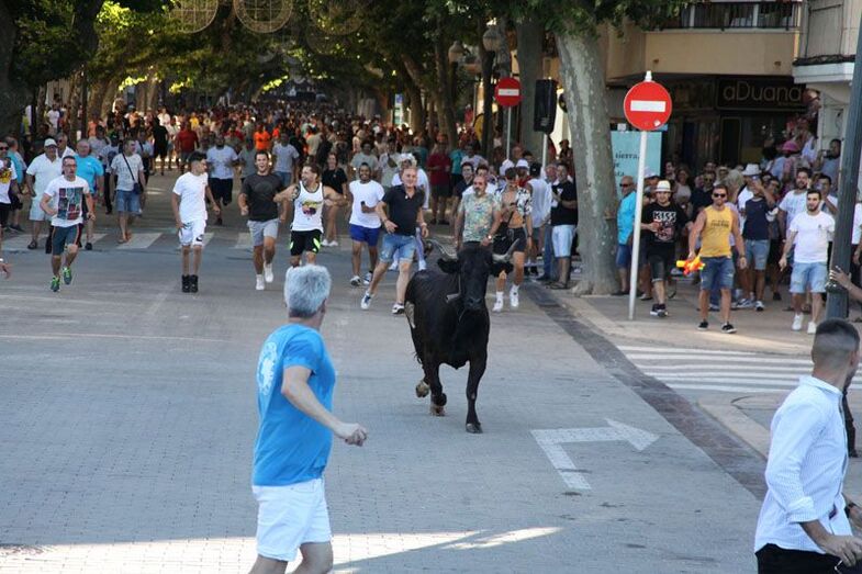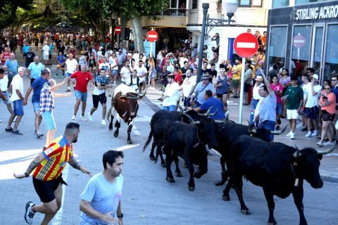 La primera entrada de bous en el marco de la Festa Major 2022 de Dénia reunió a cientos de personas en el trayecto desde Marqués de Campo hasta la plaza de toros. Un ambiente festivo que había comenzado a mediodía con el disparo del chupinazo anunciador de la fiesta.