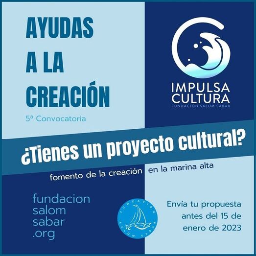 Impulsa Cultura es un programa de ayudas de la Fundación Salom Sabar de Dénia para apoyar la puesta en marcha y la producción de proyectos culturales en la Marina Alta. Como en ediciones anteriores, la convocatoria está destinada a proyectos de cualquier disciplina artística vinculados a la comarca de la Marina Alta que se desarrollen durante el año 2023. Las propuestas podrán enviarse hasta el 15 de enero de 2023 a través del formulario de inscripción facilitado en su página web.