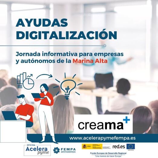 Creama, conjuntamente con la Oficina Acelera PYME de FEMPA, ha organizado una jornada informativa dirigida a empresas y personas autónomas de la Marina Alta, para presentar las actuales ayudas y subvenciones en materia de digitalización a las que pueden acceder. En esta jornada también se van a tratar los problemas a los que se enfrentan los empresas de la zona a la hora de dar el salto a la transformación digital.