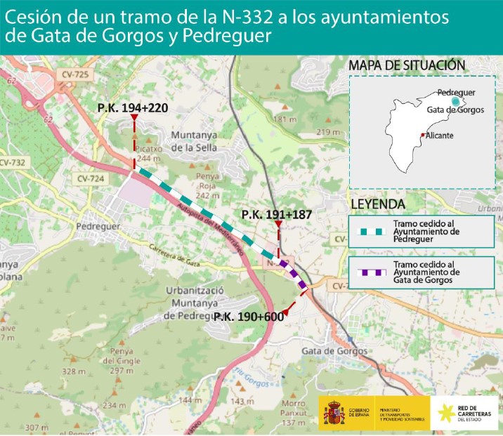 El Ministerio de Transportes y Movilidad Sostenible ha cedido a los Ayuntamientos de Gata de Gorgos y Pedreguer, ambos en la provincia de Alicante, la titularidad de un tramo de la carretera N-634 comprendido entre los kilómetros 190,600 y 194,220.