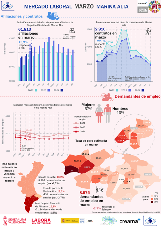 Este aumento ha supuesto que se logre un total de afiliados a la Seguridad Social en la Marina Alta de 61.813, un nuevo récord en el mes de marzo que consolida el dinamismo del mercado laboral en la comarca. El desempleo también ha disminuido con 234 personas menos. Sin embargo, esto ha supuesto una reducción menor de lo esperado, especialmente en comparación con los meses de marzo de años anteriores.
