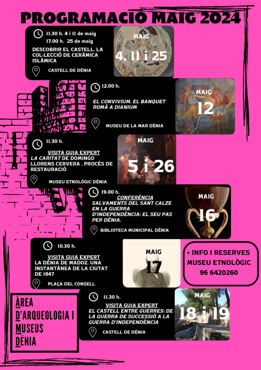 Los sábados 4 y 11 de mayo, a las 11.30 horas, y el 25 de mayo a las 17 horas, se hará la visita “Descubrir el castillo. La colección de cerámica islámica”, un recorrido diacrónico que ofrece la oportunidad de conocer la fortaleza en el transcurso del tiempo. De manera exclusiva, el público participante podrá acceder a la bodega para admirar una valiosa colección de cerámicas presentes en los hogares durante los siglos XI y XII. Las personas visitantes se encontrarán en el castillo de Dénia, frente al quiosco de tickets.