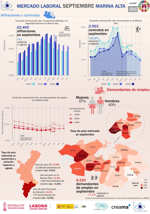 En el último mes, el mercado laboral de la Marina Alta ha presentado una caída superior a la registrada en septiembre de 2023 (1.143 personas afiliadas a la Seguridad Social menos) y similar a los niveles observados entre 2014 y 2019, antes de la pandemia. A nivel nacional, autonómico y provincial, el comportamiento del empleo ha sido más estable que en la comarca, aunque mostrando ligeras variaciones. Este hecho muestra el impacto negativo que posee el fin de las vacaciones y la dependencia que La Marina tiene del turismo.