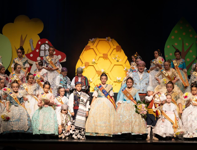 A continuación, más de 70 falleros y falleras llenaron el escenario de luz y color, dejando lista la colmena para recibir a su reina. Una voz en off anunció la llegada de la Fallera Mayor Infantil, Júlia Masó i Perles, quien apareció acompañada por la agente de policía local Aranzazu Cabanes i Sempere, mientras un trono descubría el panel de las abejas. Emma Masó, hermana de Júlia, fue la encargada de colocarle la banda acreditativa como Fallera Mayor Infantil.