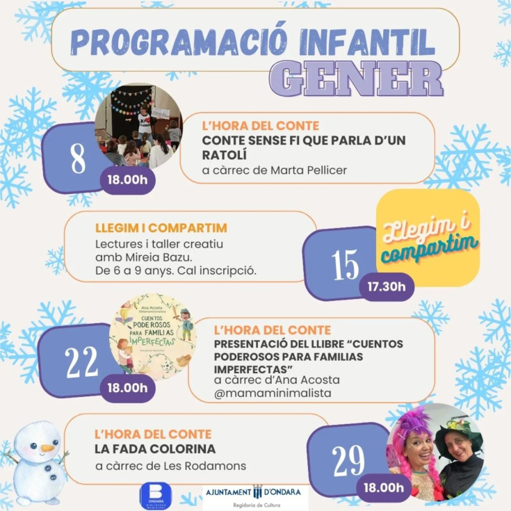 Según adelantó la concejala de Cultura, Rosa Ana Marí, esta edición de 2025 incluye novedades como la narración de los cuentos por profesionales y, además, que una sesión al mes, a partir de febrero, se realizará en inglés gracias a la colaboración de Mary Beth Canon, auxiliar de conversación americana del CEIP Sanchis Guarner de Ondara.