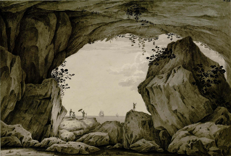El primero de estos dibujos lleva por título Vue du Cap Saint Antoine (Fig. 02). Se trata de la obra original que dio pie a la elaboración del grabado en la publicación Voyage pittoresque. Realizado en tintas grises sobre papel, nos muestra la oquedad de entrada, bastante fiel a la realidad, dejando adivinar esas grandes rocas en la parte baja de la entrada. Una pequeña embarcación con las velas recogidas y dos pescadores faenando se encuentra en el primer plano. Entre las rocas de la entrada, se aprecian otras dos figuras minúsculas, una de pie con una caña de pescar y otra sentada en las rocas, con un libro o cuaderno entre sus piernas, ¿pudiera ser un autorretrato del pintor de la obra en el momento de estar tomando estos apuntes?, no lo sabemos, pero ahí lo dejamos. El tamaño de estas figuras frente a la grandiosidad de las rocas, es un efecto del romanticismo para engrandecer aún más la inmensidad de lo representado. Los efectos de claroscuro del primer plano frente a la profundidad de la cueva son de gran efectismo. Aunque la imagen se acerca a la imitación de la realidad, las masas vegetativas que caen desde lo alto de la cueva, o los árboles en la profundidad y de la cima de los acantilados, son unas licencias un tanto inventadas.