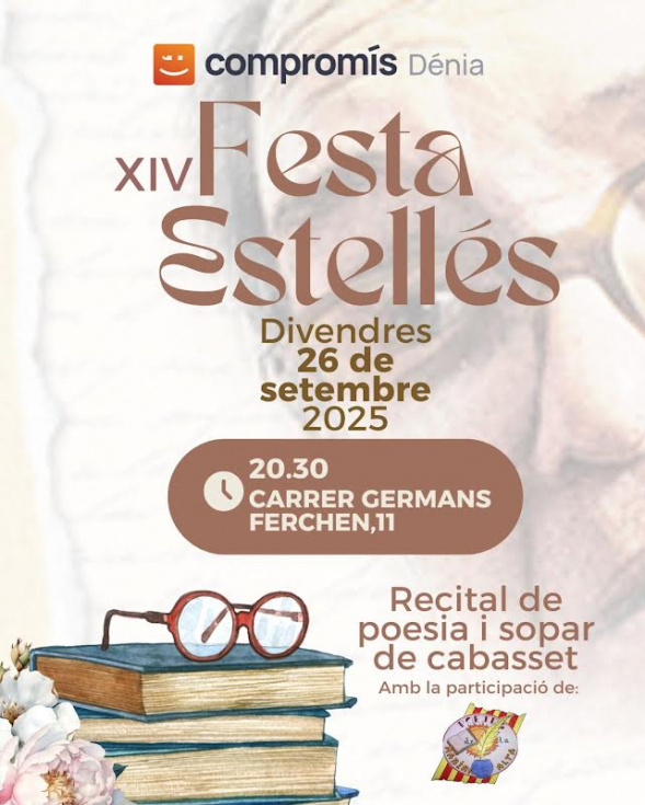 Compromís per Dénia celebrará el próximo viernes 26 de septiembre a las 20:30 horas una nueva edición de la Festa Estellés, un homenaje ya consolidado en el calendario cultural local. El acto tendrá lugar en la calle Germans Ferchen, número 11, sede del colectivo local, y contará con la participación del grupo Poetes de la Marina, que pondrán voz a los versos en una velada abierta a vecinos y visitantes.