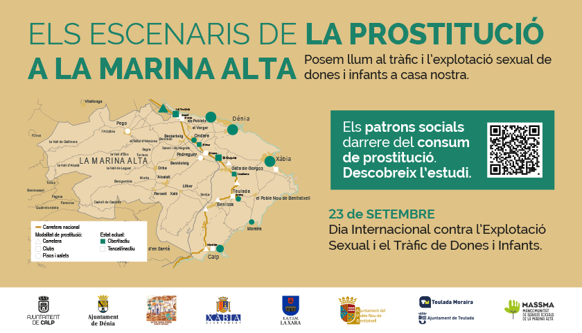 Con motivo del 23 de septiembre, Día Internacional contra la Explotación Sexual y la Trata de Mujeres y Menores, la Xarxa Comarcal d’Igualtat ha presentado una nueva campaña de sensibilización bajo el lema: Los escenarios de la prostitución en la Marina Alta. Ponemos luz al tráfico y la explotación sexual de mujeres en nuestra comarca.