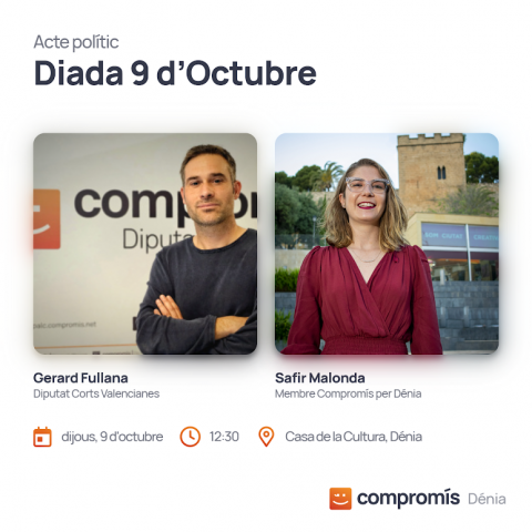 Compromís per Dénia ha anunciado la celebración de su acto tradicional con motivo del 9 d’Octubre, que tendrá lugar el jueves 9 de octubre a las 12.30 horas en la plaza Jaume I, una vez finalizado el acto institucional organizado por el Ayuntamiento de Dénia.