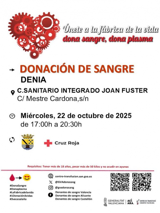 El Centro de Transfusión de la Comunitat Valenciana ha programado una nueva jornada de donación de sangre en Dénia dentro de la campaña que se está desarrollando en varias localidades de la Marina Alta durante el mes de octubre.