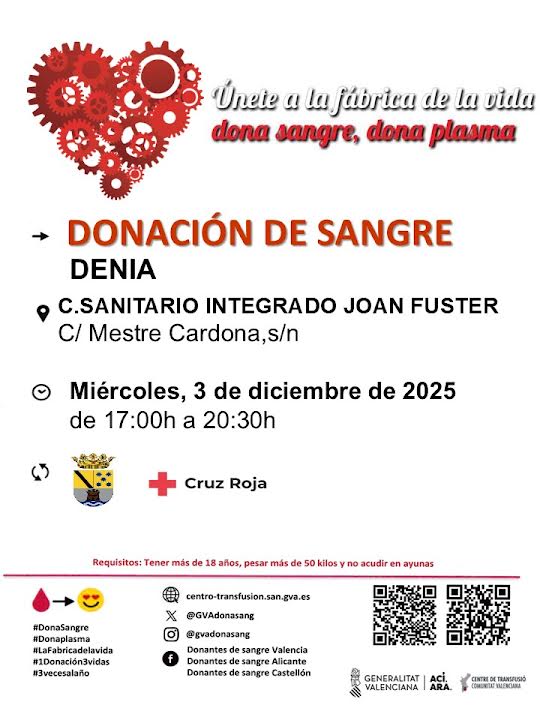 Dénia celebra esta tarde, miércoles 3 de diciembre de 2025, una nueva jornada de donación de sangre organizada junto al Centro de Transfusión de la Comunitat Valenciana. La convocatoria tendrá lugar en el Centro Sanitario Integrado Joan Fuster, situado en la calle Mestre Cardona, s/n, en horario de 17:00 a 20:30 horas.