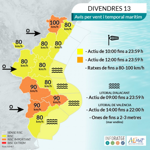 La Conselleria de Emergencias e Interior, a través del Centro de Coordinación de Emergencias de la Generalitat Valenciana (CCE), ha emitido un aviso especial ante el temporal de viento previsto para este sábado 14 de febrero, jornada en la que se espera que el episodio se intensifique en la Comunitat Valenciana.