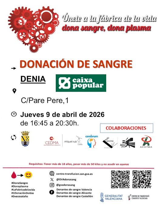 Dénia acogerá una nueva jornada de donación de sangre el próximo jueves 9 de abril de 2026, en una convocatoria destinada a reforzar las reservas hospitalarias y garantizar el suministro en los centros sanitarios.