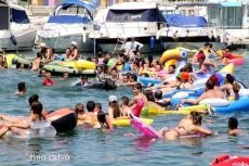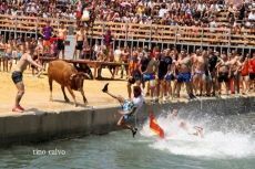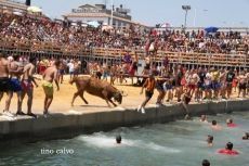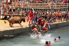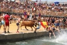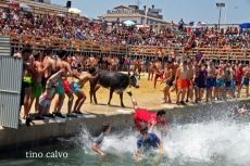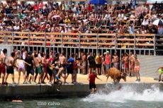 Segunda tarde de bous a la mar en Dénia, con los toreros intentando llevarse al toro al agua para darse un baño